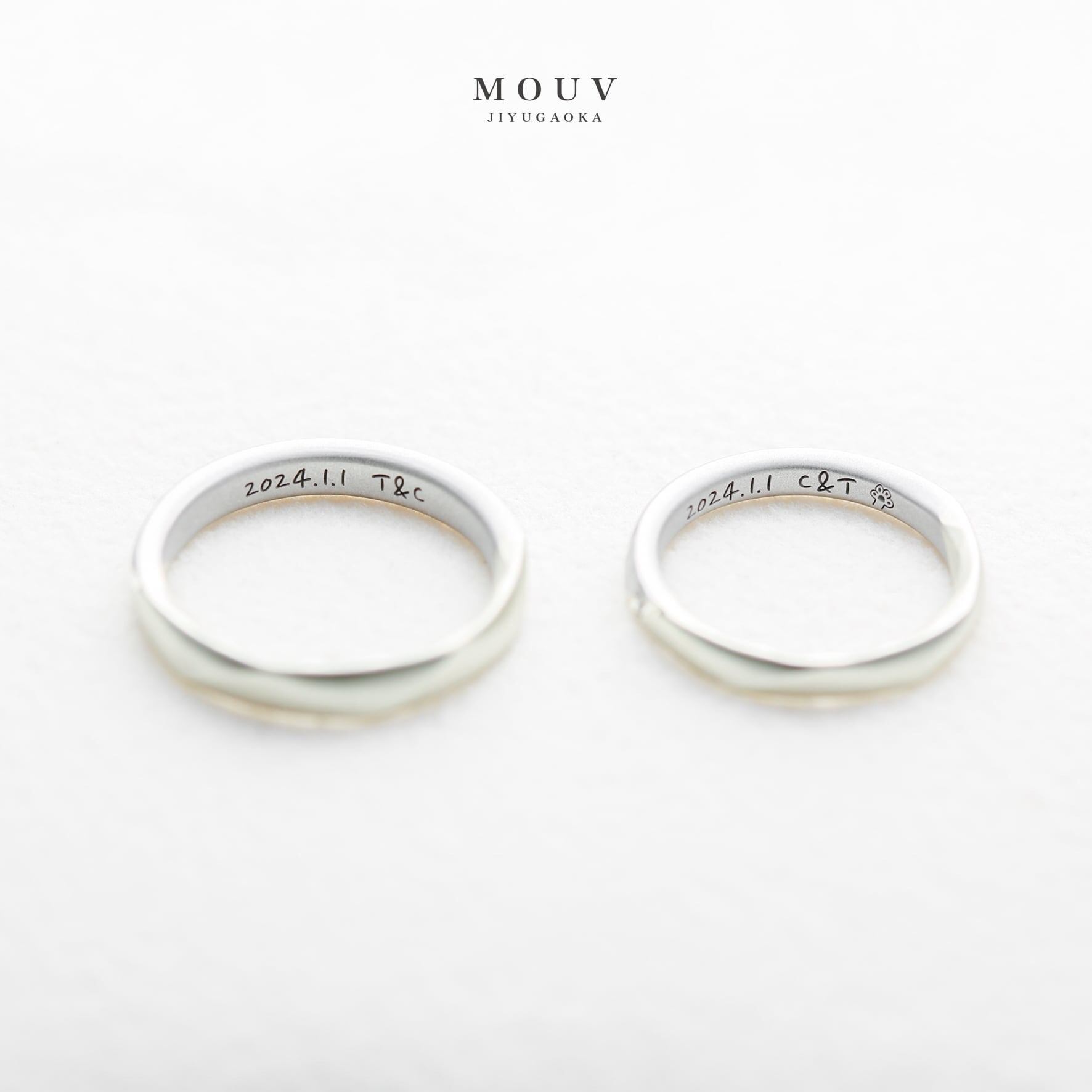 お揃いの素材とデザインですが、内側に鎚目のテクスチャーを入れていたり、女性リングにはダイヤを留めたり、さりげないこだわりが詰まっています。