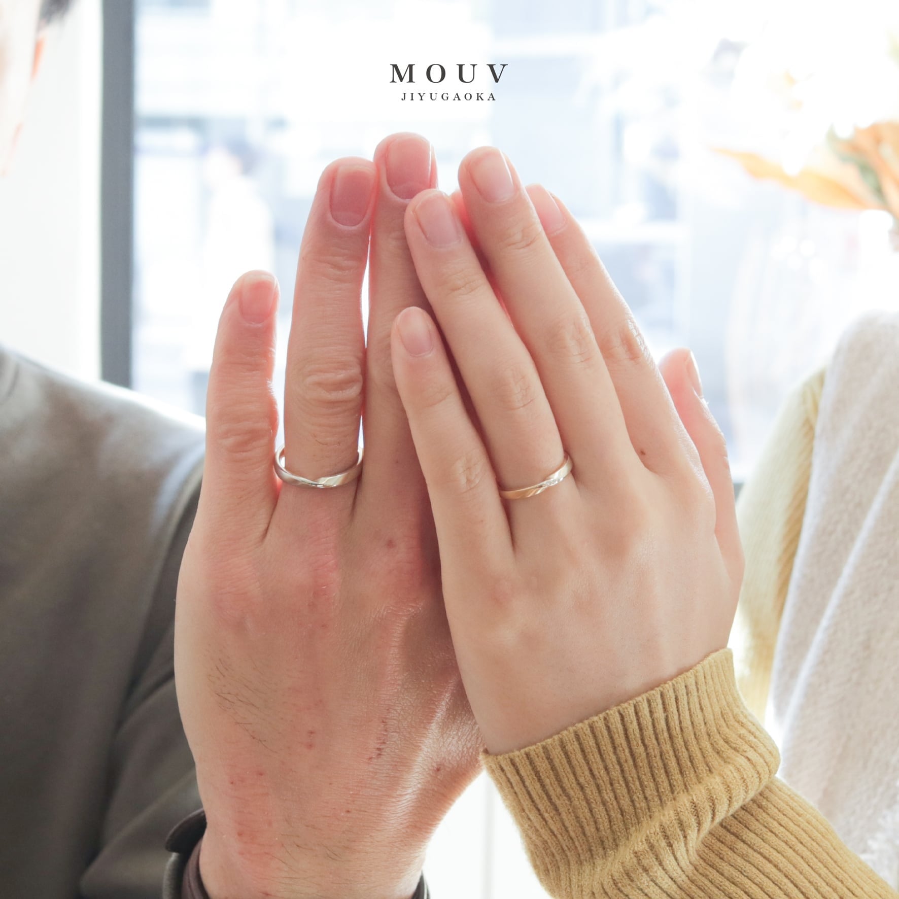 女性リングにはダイヤを3つあしらい、優美な結婚指輪が完成しました