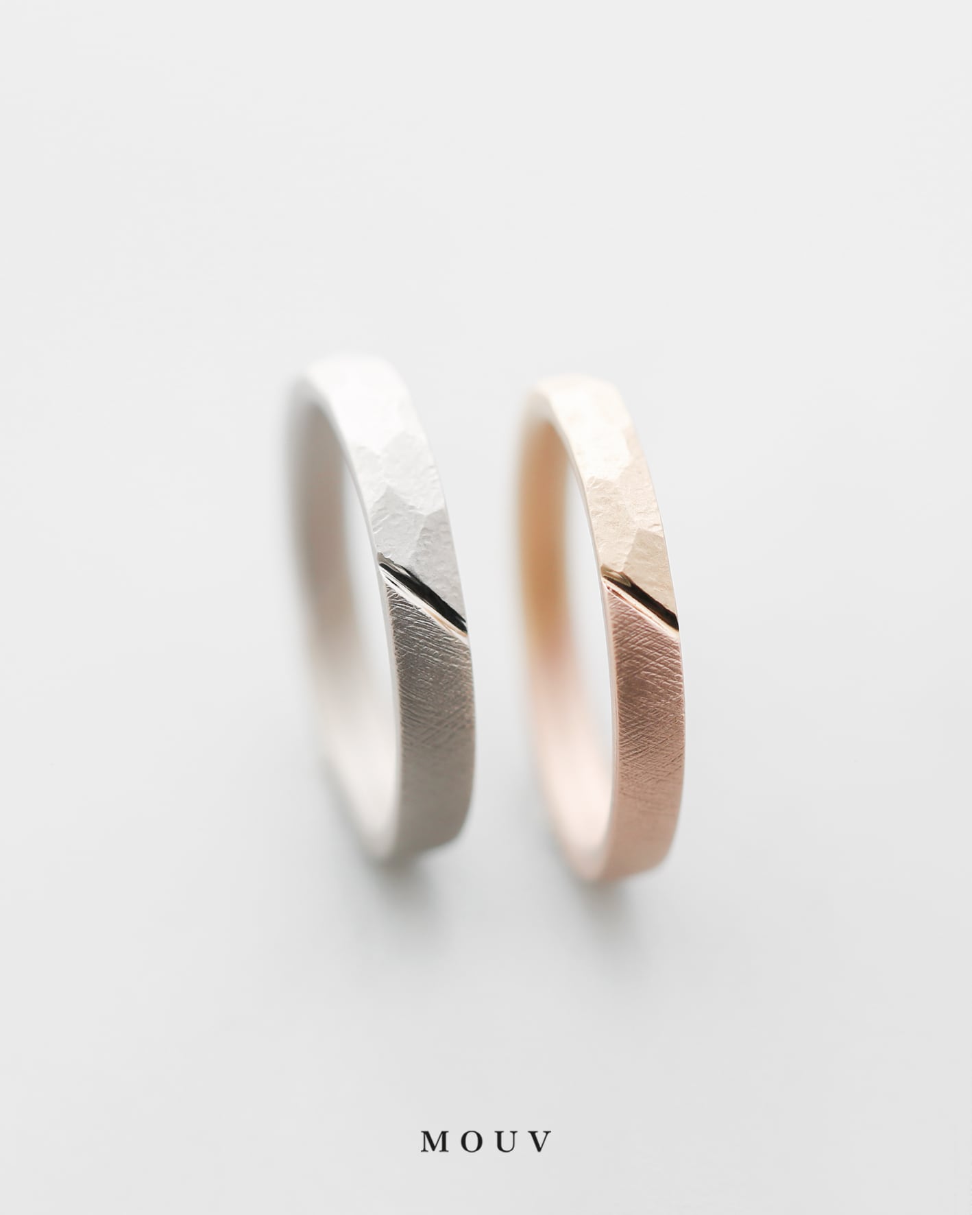 お揃いのテクスチャーにそれぞれ好みの素材を組み合わせた結婚指輪。