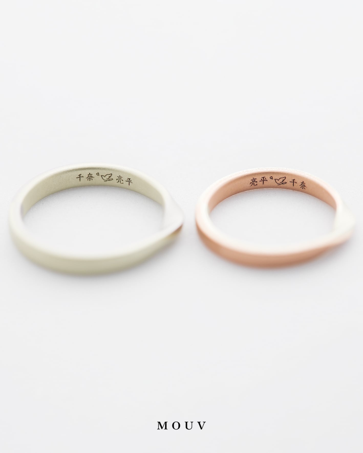 側面にテクスチャーを取り入れたり、内側にイラスト刻印を添えたりと細やかな工夫が光る結婚指輪です。
