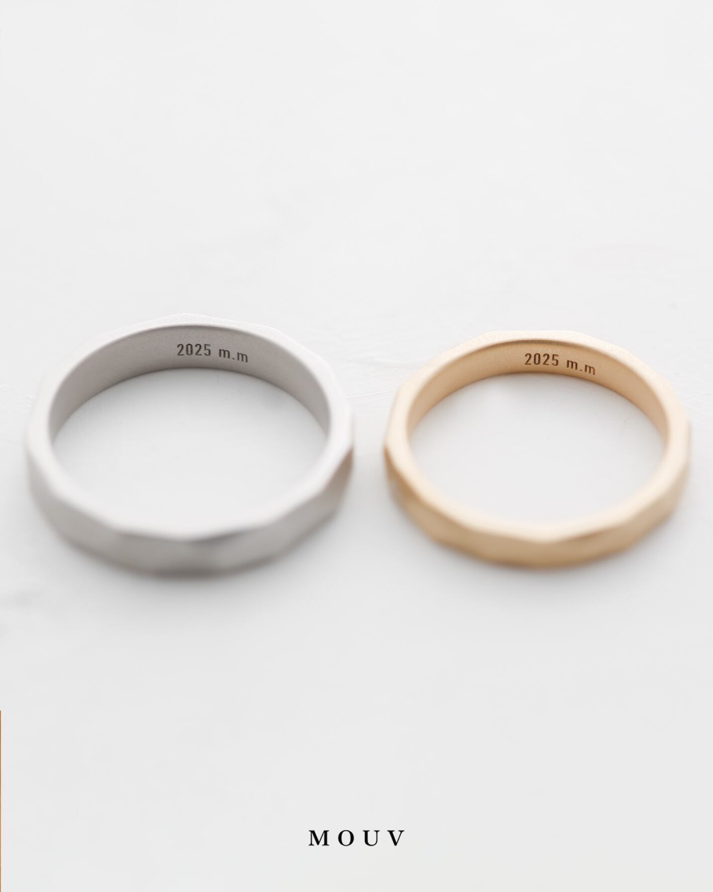穏やかな色味とラフな形が特別な存在感を漂わせる唯一無二の結婚指輪に。