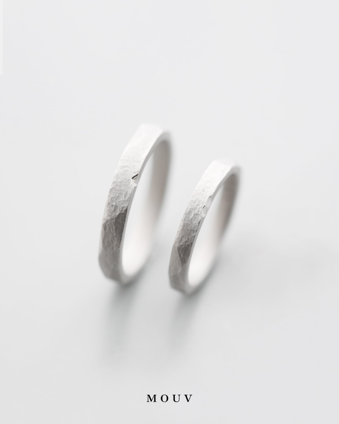 穏やかな色味とラフな形が、特別な存在感を漂わせる唯一無二の結婚指輪に。