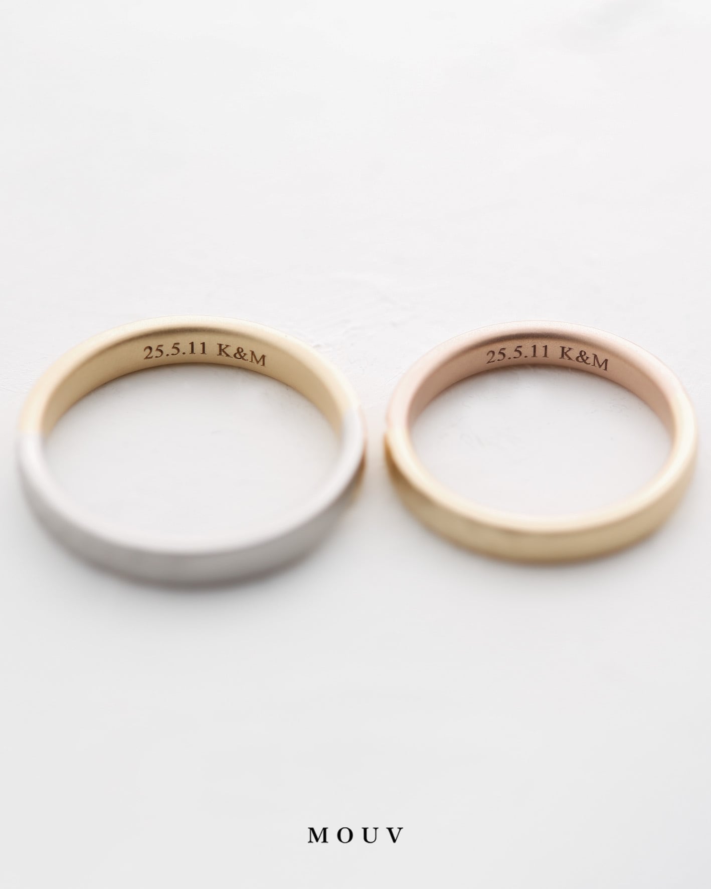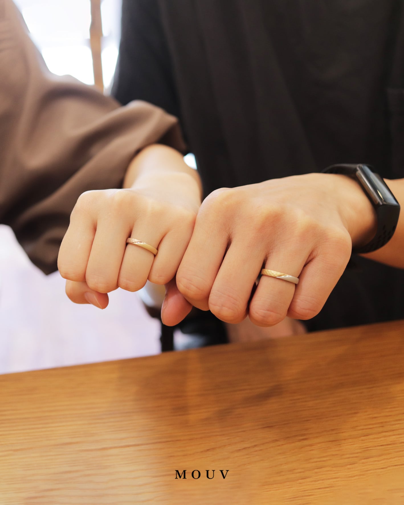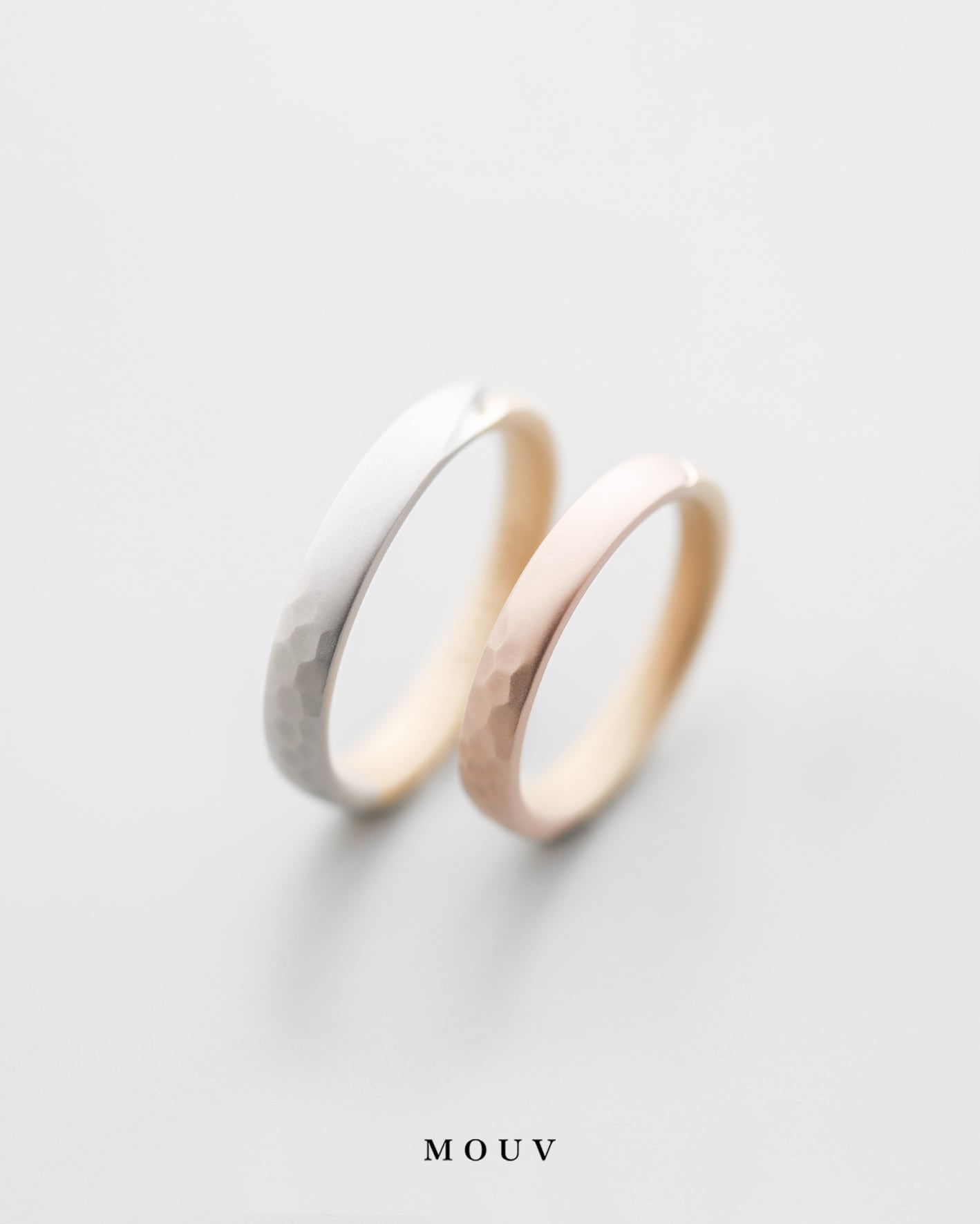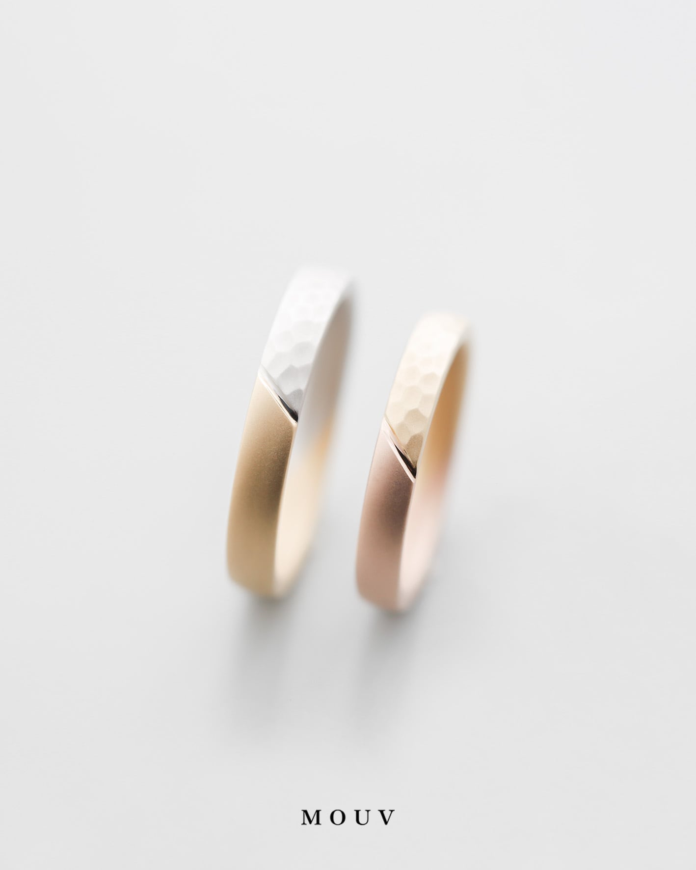 色の組み合わせとテクスチャが美しい結婚指輪。