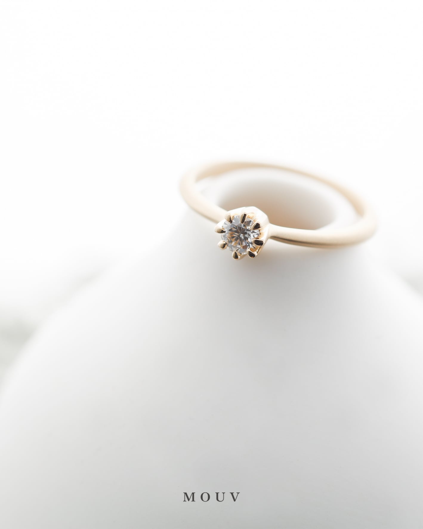 イエローゴールドの8本の爪がダイヤモンドを優しく包み、その輝きを際立たせます。