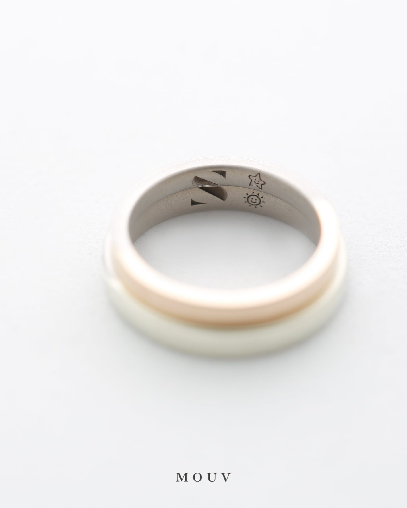 リングを重ね合わせると内側に大きなSの文字が浮かび上がり、隣に太陽と星の刻印を施しました。