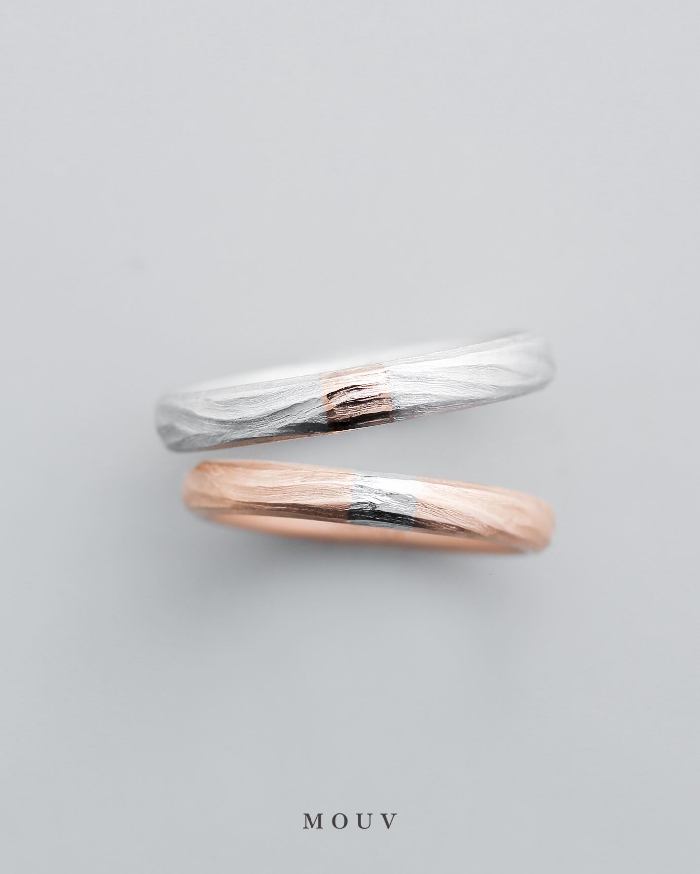お互いの指輪の一部を交換するように素材を組み合わせた、部分コンビネーションカラーがおしゃれです。